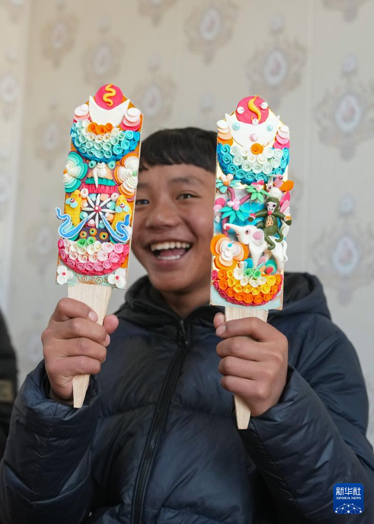 在拉萨市老城区,小学徒在展示刚刚做好的一对酥油花(2月25日摄)。