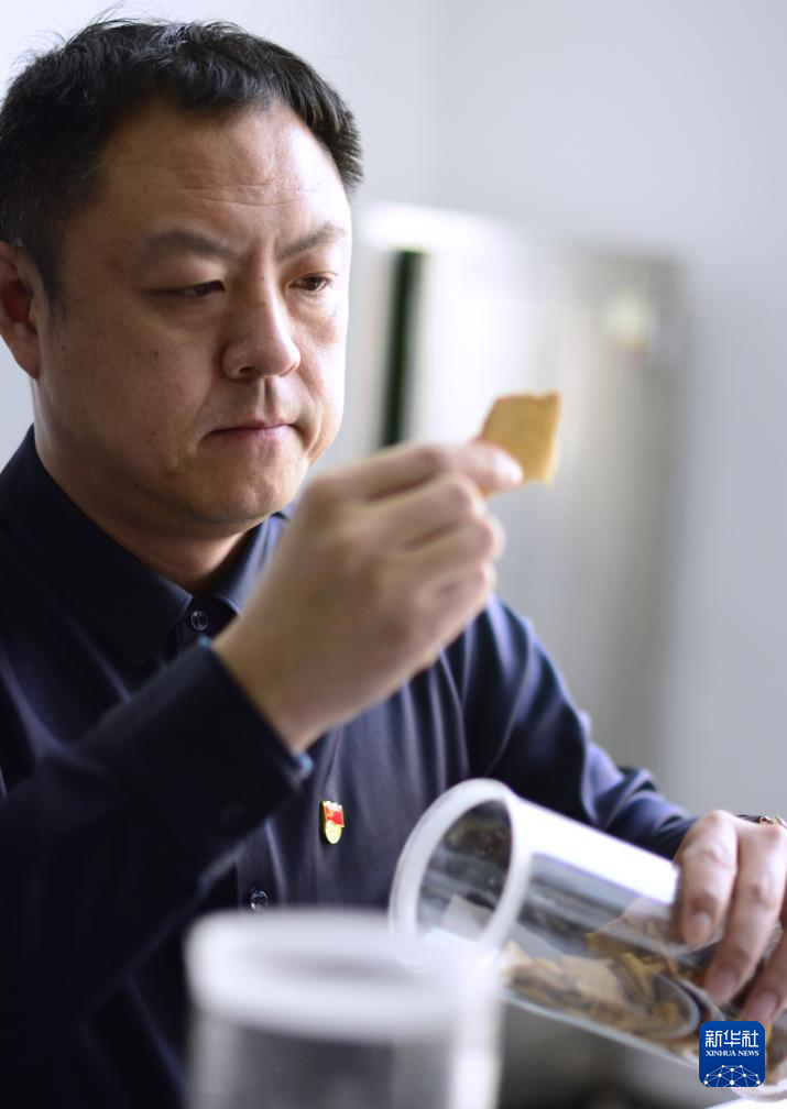 2月23日,同仁堂股份有限公司药材鉴别首席技师郭朝晖在检验中药材原材料。