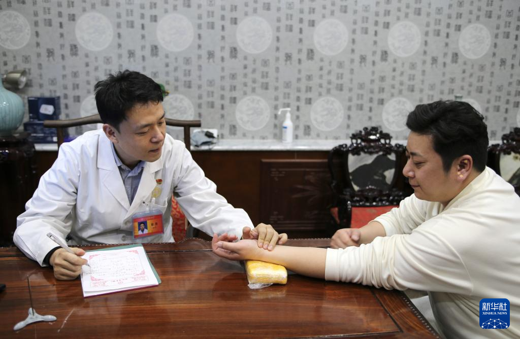 2月25日,中医专家郝鹏(左)在位于北京前门大栅栏商业区的同仁堂医馆为患者把脉。
