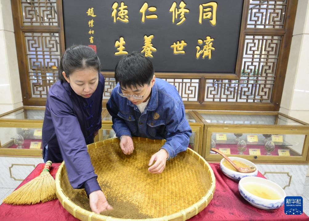 2月23日,同仁堂国家级非物质文化遗产生产性保护示范基地项目成员、中药炮制技艺首席技师吕建媛在展示传统中药材炒制技艺。