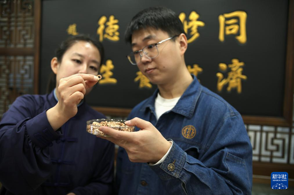 2月25日,北京同仁堂科技发展股份有限公司亦庄分厂技师李宁(左)在给徒弟传授中药选材知识。1980年出生的李宁,从小对中医药产生浓厚的兴趣,1999年进入了同仁堂从事中药泛丸的制作工作。由于同仁堂西黄丸靠传统手工制作无法满足市场需求,李宁带领团队将传统制药技艺与现代化制药设备相结合,大幅度提升了西黄丸的成品率和产能。2015年,以李宁名字命名的首席技师工作室挂牌成立,李宁也带起了徒弟。