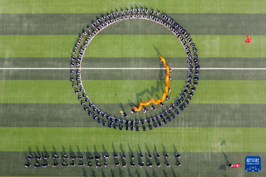 2月28日,山东省淄博科技学校龙狮社团的学生在操场上舞龙(无人机照片)。