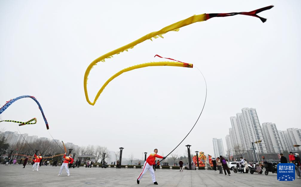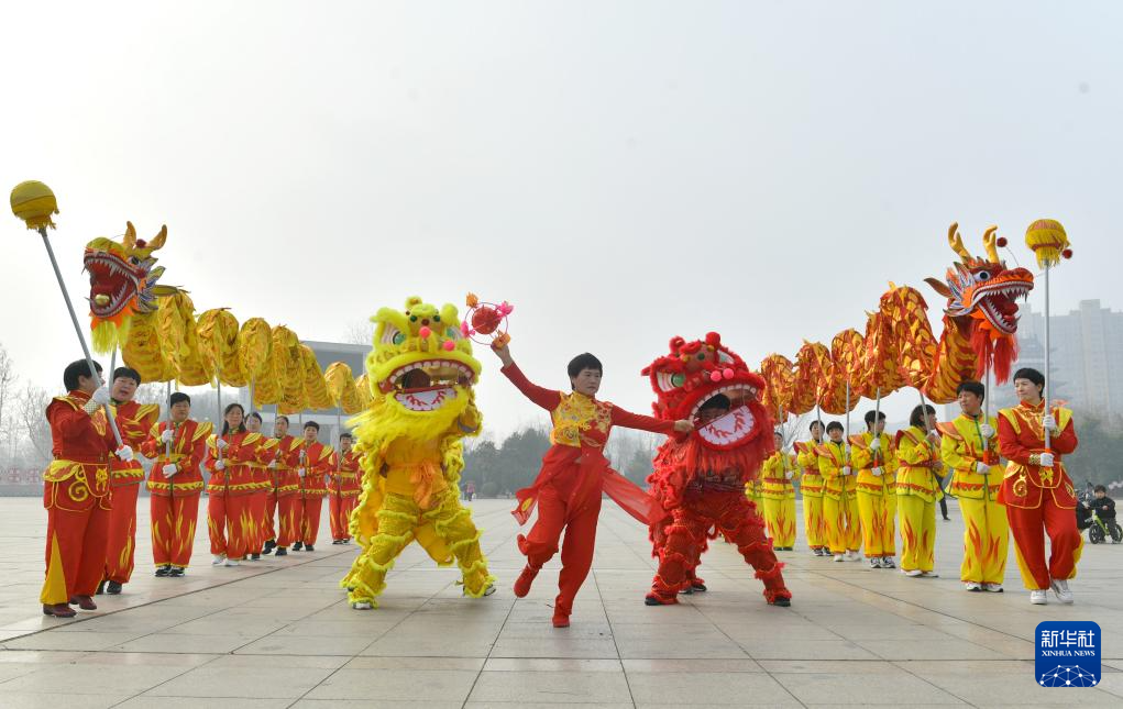 3月1日,河南省夏邑县舞龙队在长寿广场开展舞龙舞狮活动。