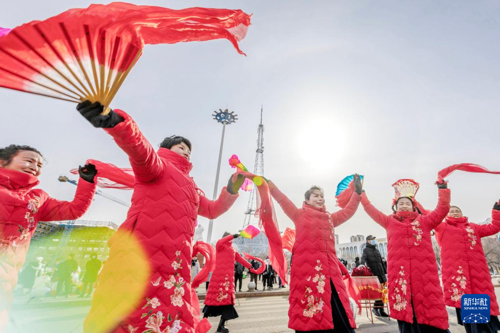 3月1日,市民在黑龙江省齐齐哈尔市工人文化宫广场扭秧歌。