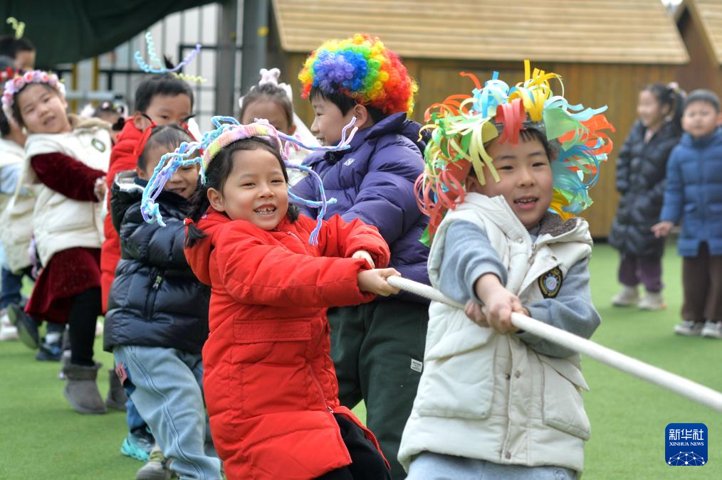 2月28日,山东省青岛市宝城幼儿园的小朋友们进行“拔龙须”比赛。