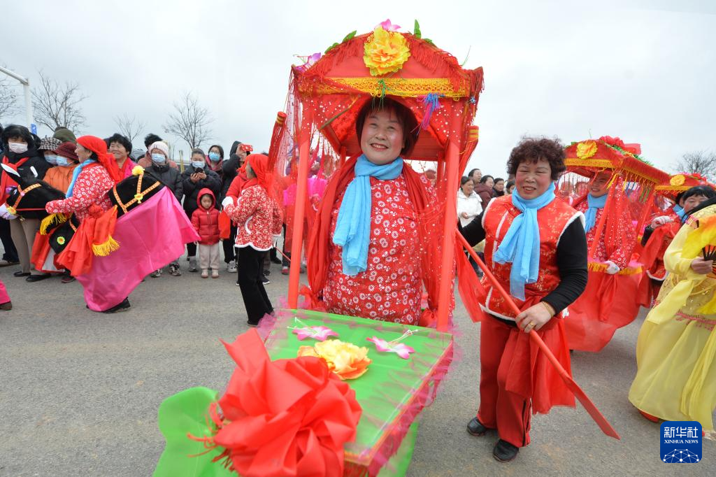 3月1日,居民在山东省青岛市城阳区红岛街道高家社区表演“划旱船”。
