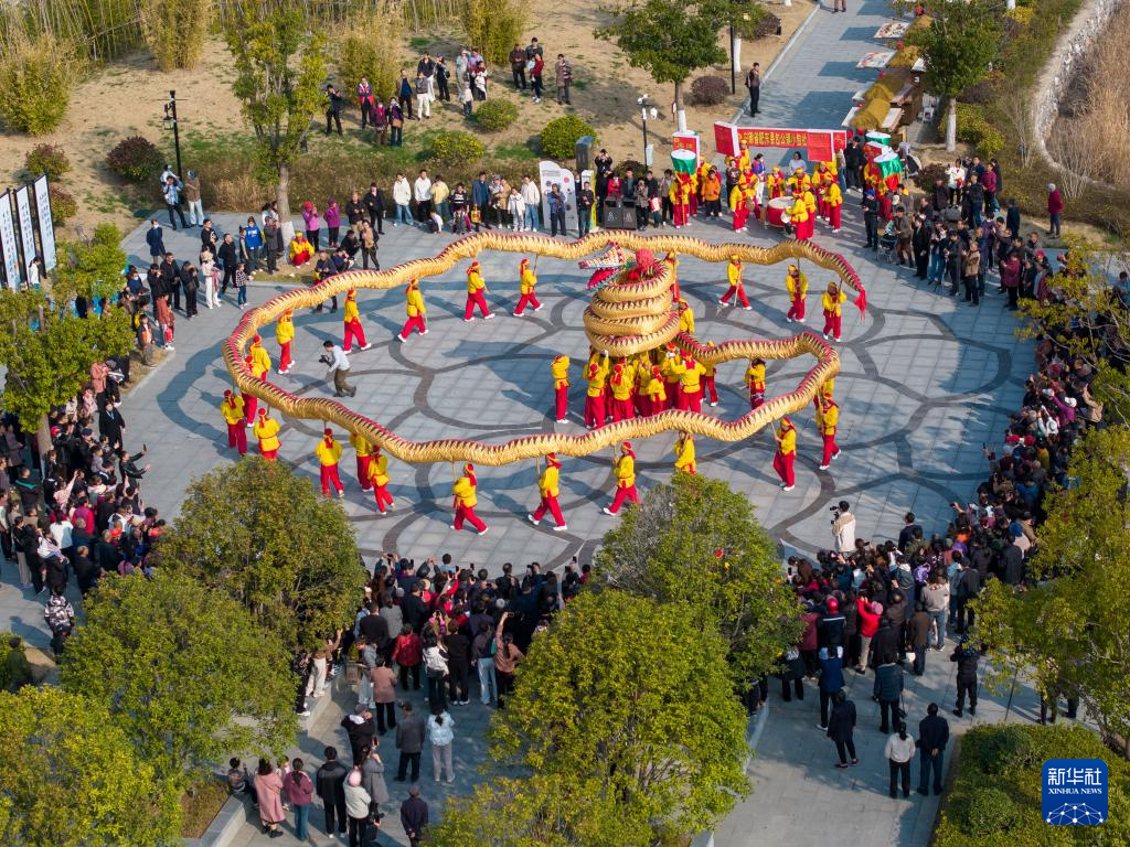 3月1日,在浙江省湖州市吴兴区八里店镇潞村举行的“二月二龙抬头”传统文化活动上,人们表演具有当地特色的“稻穗龙舞”。