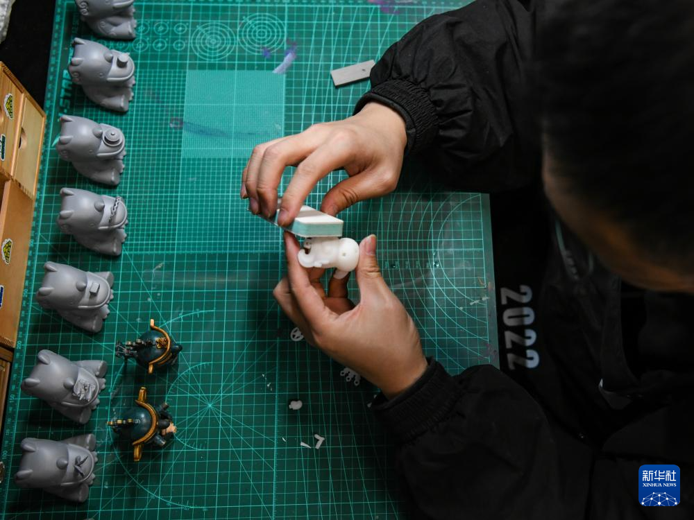3月1日,曾舟(左)和同事在工作间打磨文创产品模型。