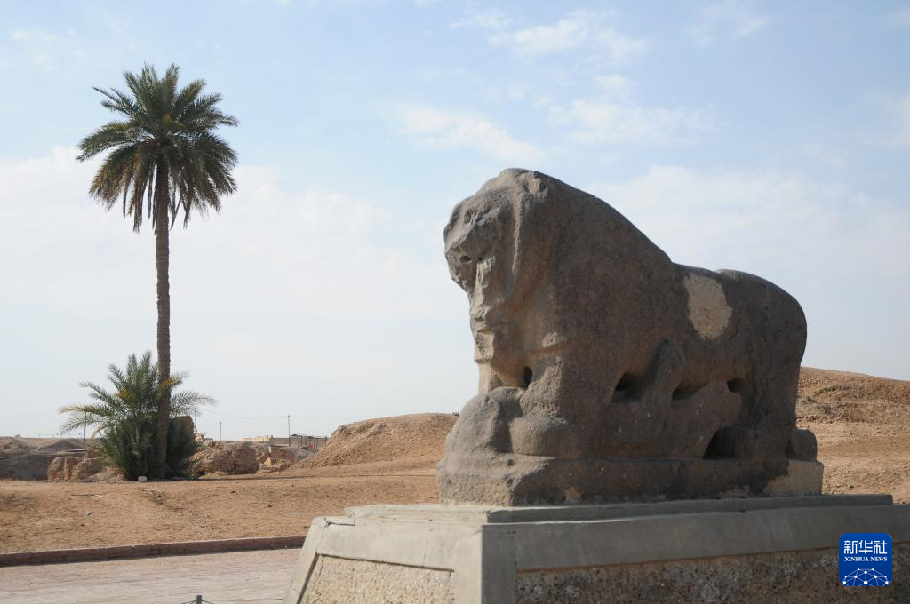 这是3月4日在伊拉克巴比伦省的巴比伦古城遗址拍摄的巴比伦石狮雕像。