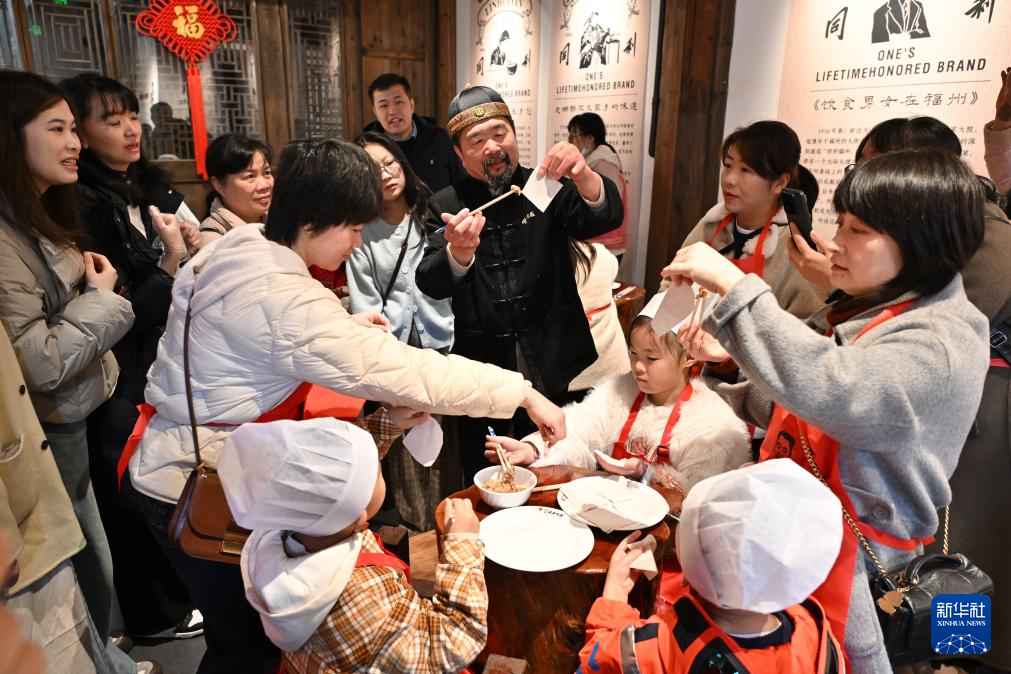 3月8日,家长带领小朋友游览福州三坊七巷同利肉燕非遗文化体验馆。