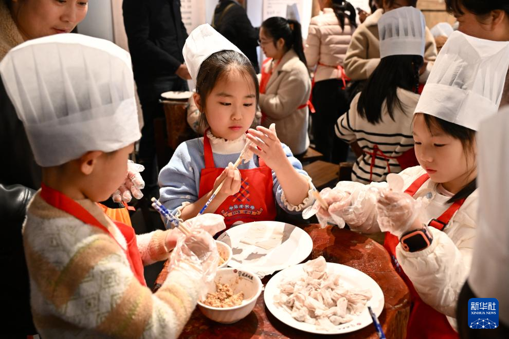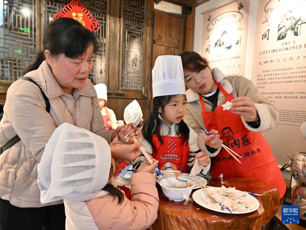 3月8日,在福州三坊七巷同利肉燕非遗文化体验馆内,小朋友在包肉燕。
