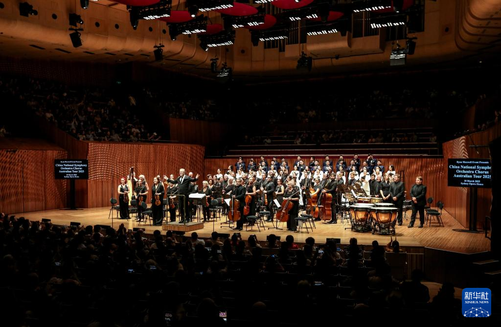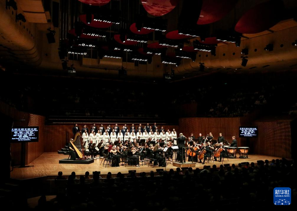3月10日,在澳大利亚悉尼歌剧院,来自中国交响乐团合唱团和澳大利亚管弦乐团的成员们共同演绎《黄河大合唱》。