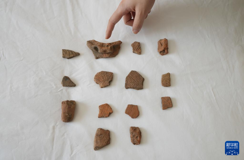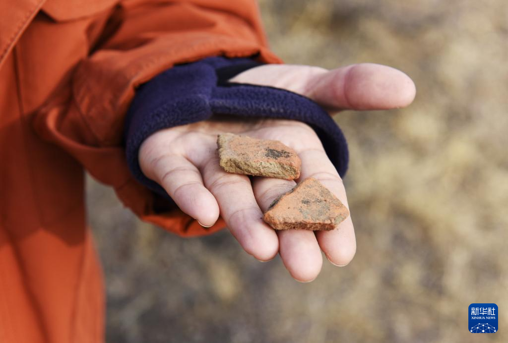 3月11日,在辽宁省朝阳市双塔区,考古人员展示在调查现场发现的碎陶片。
