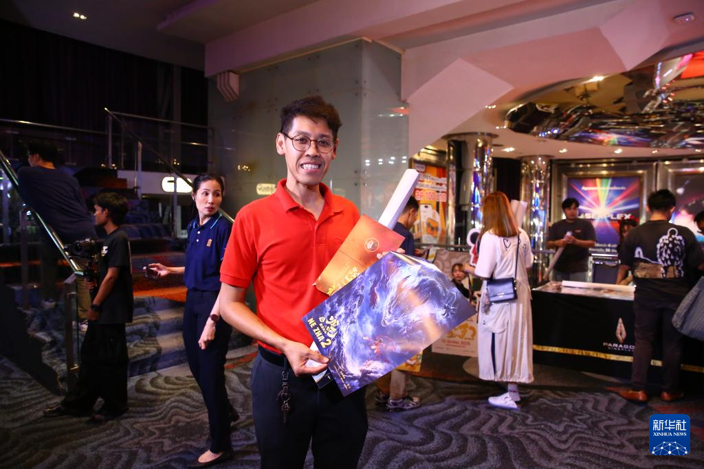 3月12日,在泰国曼谷暹罗百丽宫,参加《哪吒2》首映活动的大学教师差瓦立向记者展示他领取的海报。