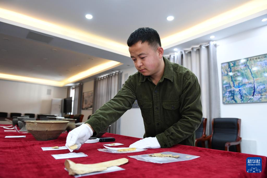 2025年2月25日,在位于陕西省宝鸡市的周原田野考古中心,陕西省考古研究院研究实习员闫永强在查看周原遗址出土文物。新华社记者 李一博 摄