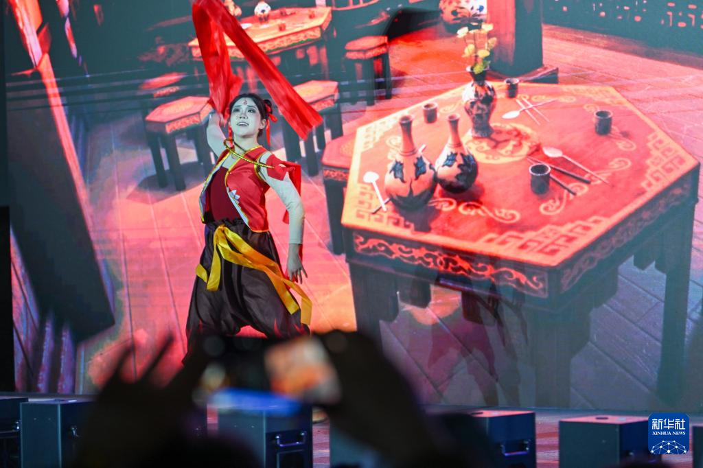 身着哪吒服饰的演员在天津哪吒小镇为游客演出(3月15日摄)。