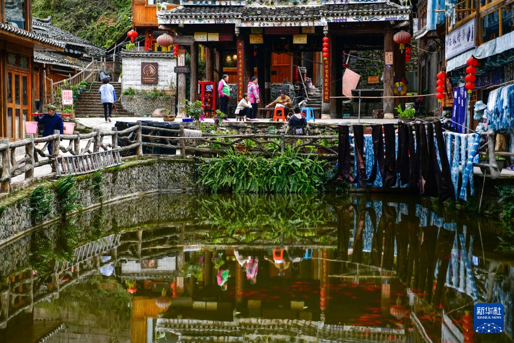 3月18日,村民在贵州省黎平县肇兴侗寨里晾晒侗布。