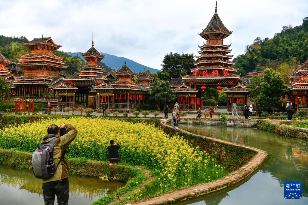 3月17日,游客在贵州省黎平县肇兴侗寨寨门外拍照。