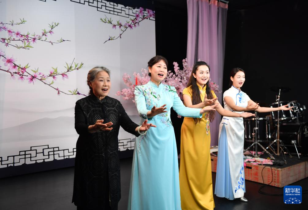 3月19日,“50后”的常德丝弦名家宋洁(左一)、“60后”的常德丝弦代表性传承人朱晓玲(左二)、“80后”的常德丝弦青年传承人伍恩禹(右二)与“90后”青年演员代表谢颜竹(右一)四代曲艺人共同排练曲目。