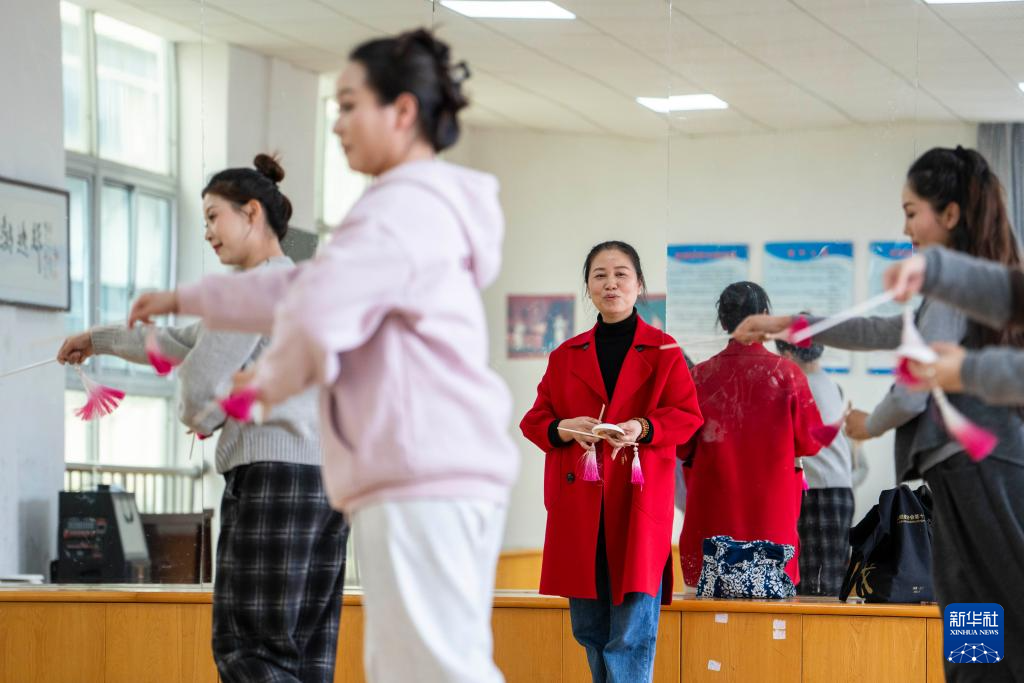 3月17日,“60后”的常德丝弦代表性传承人朱晓玲(左三)在指导青年演员练功。