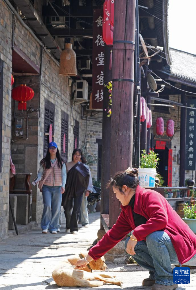 张谷英村村民在屋外给小狗梳理毛发(3月21日摄)。