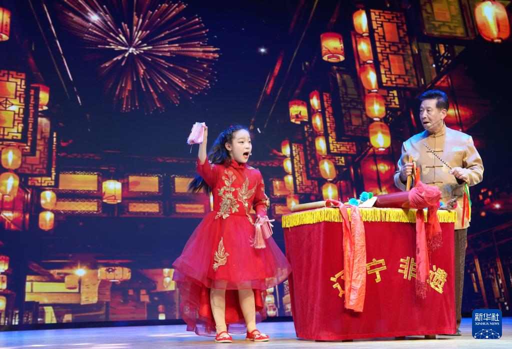 3月26日,8岁的金书瑶(左)和师父赵国祝一起表演快板书《长安街上逛花灯》。