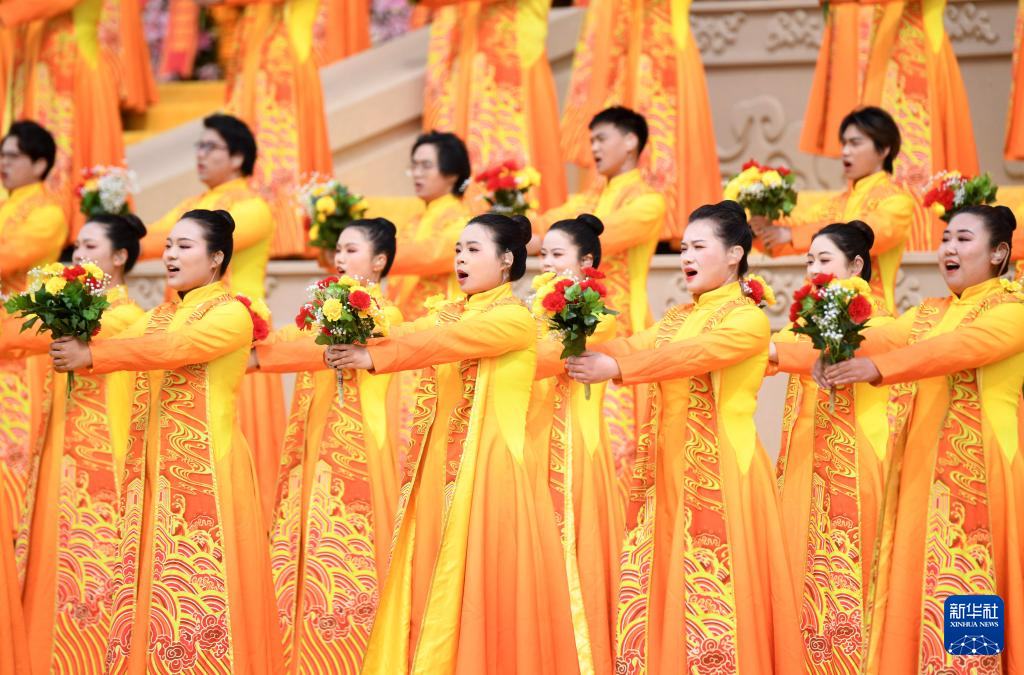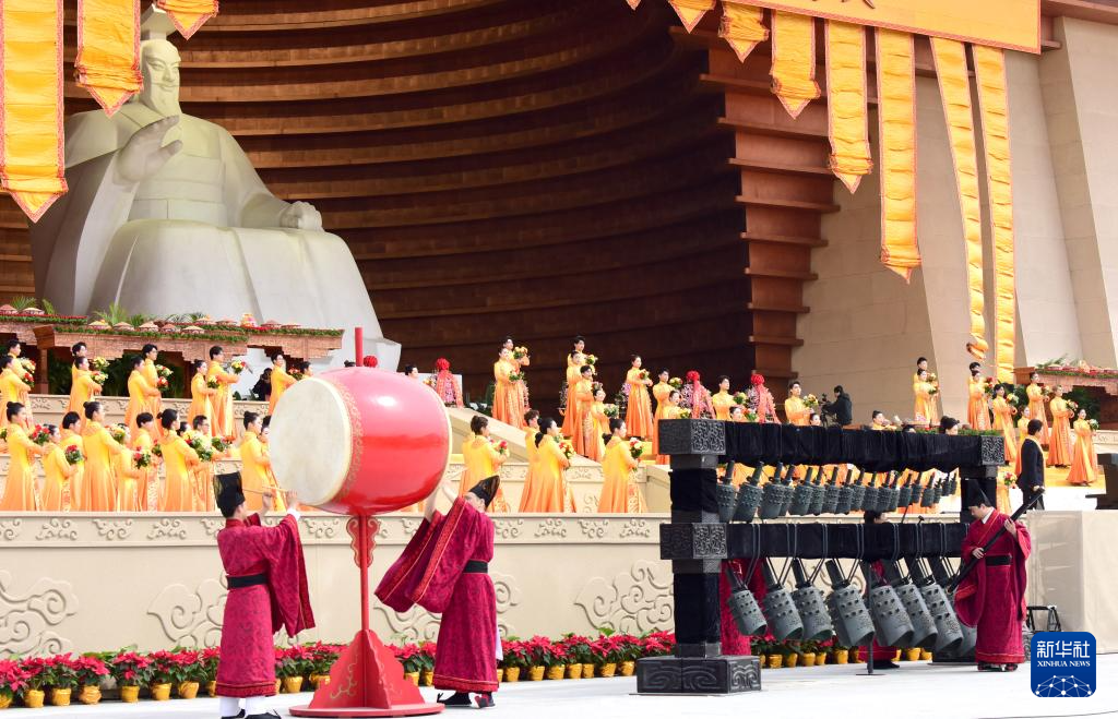 黄帝故里景区庄严肃穆,众多来自海内外的华夏儿女汇聚在这里,共拜轩辕黄帝,祈福祖国繁荣昌盛,祝愿世界和平和睦。典礼仪程共九项,包括盛世礼炮、敬献花篮、净手上香、共拜始祖、恭读拜文、高唱颂歌、乐舞敬拜、祈福中华、天地人和。