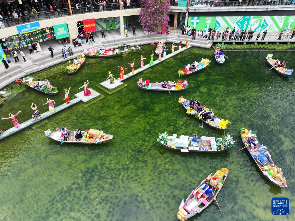 这是3月31日拍摄的开幕式现场的水上市集(无人机照片)。