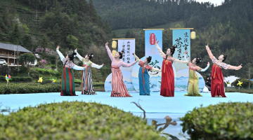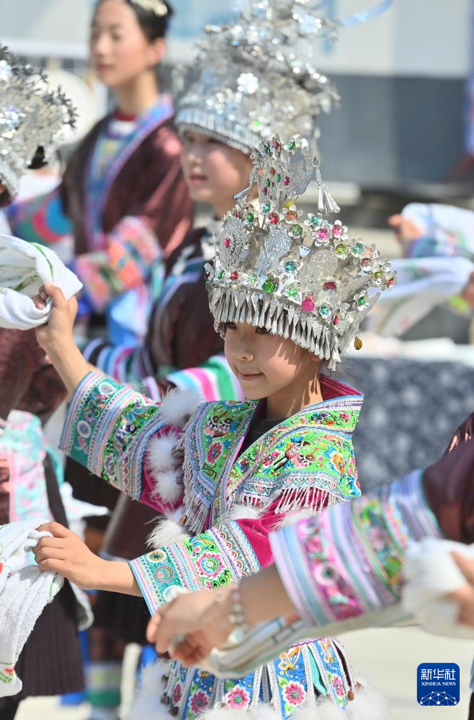 3月25日,在广西柳州市融水苗族自治县杆洞乡中心小学,乡村少年宫的学生在跳芦笙踩堂舞。
