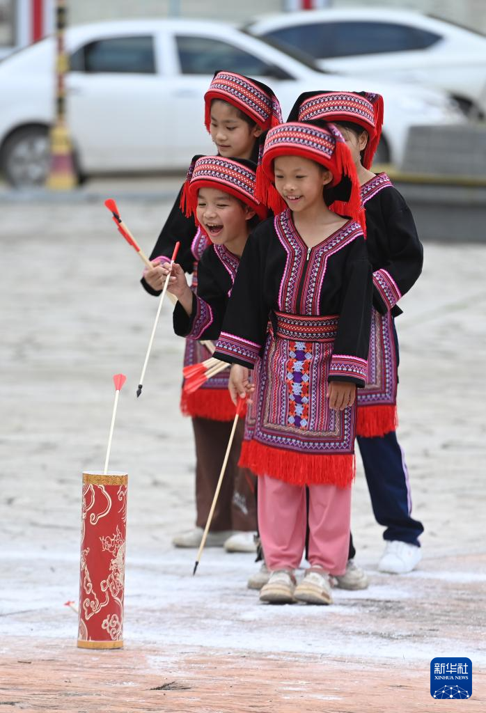 2024年3月25日,在广西梧州市苍梧县六堡镇山坪村,瑶族小朋友在体验投壶运动。