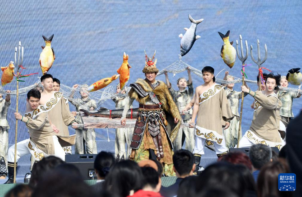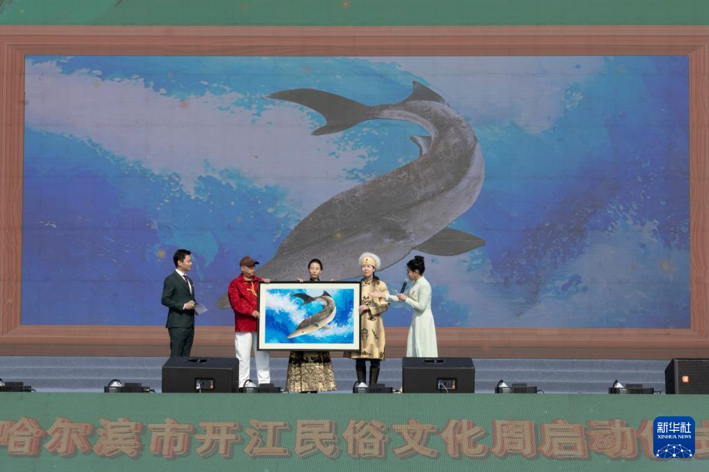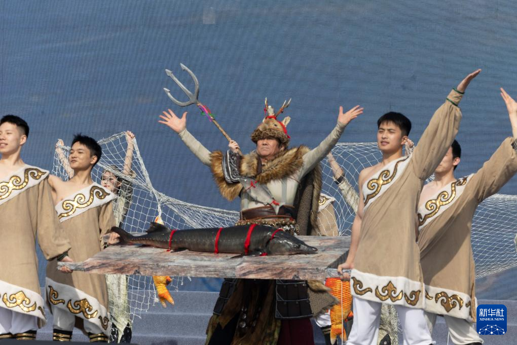 4月16日,演职人员在2025哈尔滨市开江民俗文化周启动仪式现场展示“头鱼”。