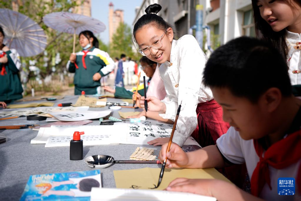 4月17日,兴庆区实验第二小学学生在活动上体验书法写作。