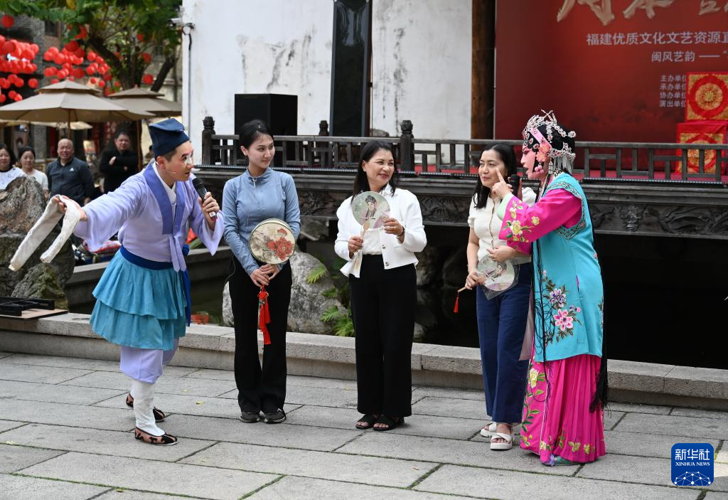 4月6日,福州闽剧艺术传承发展中心演员与游客在福州上下杭历史文化街区开展浸入式互动演出。