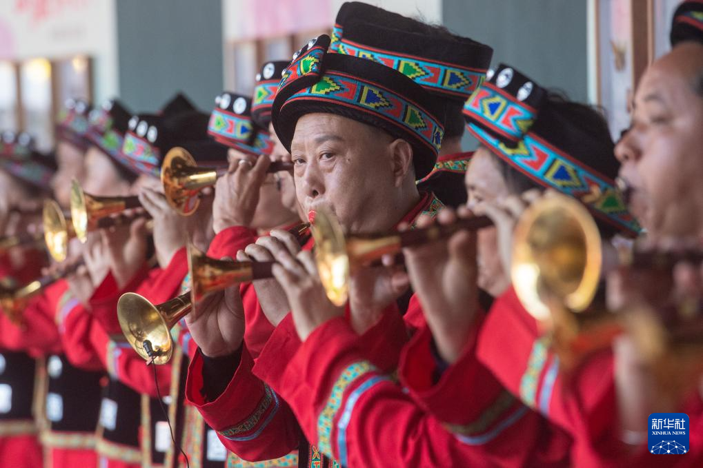 4月28日,苗族同胞在传统节日踩花山节上演奏乐器。