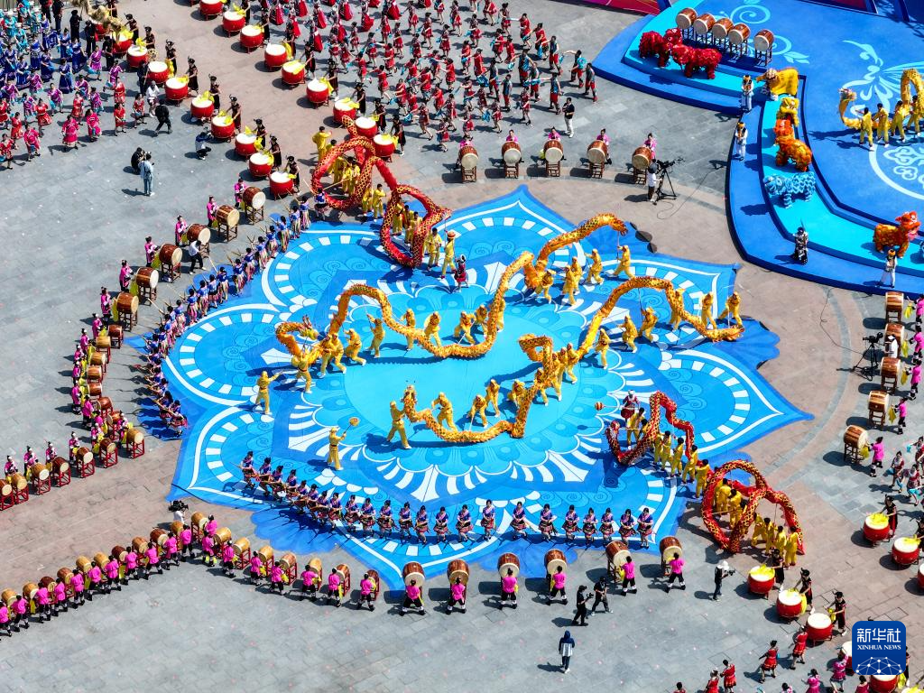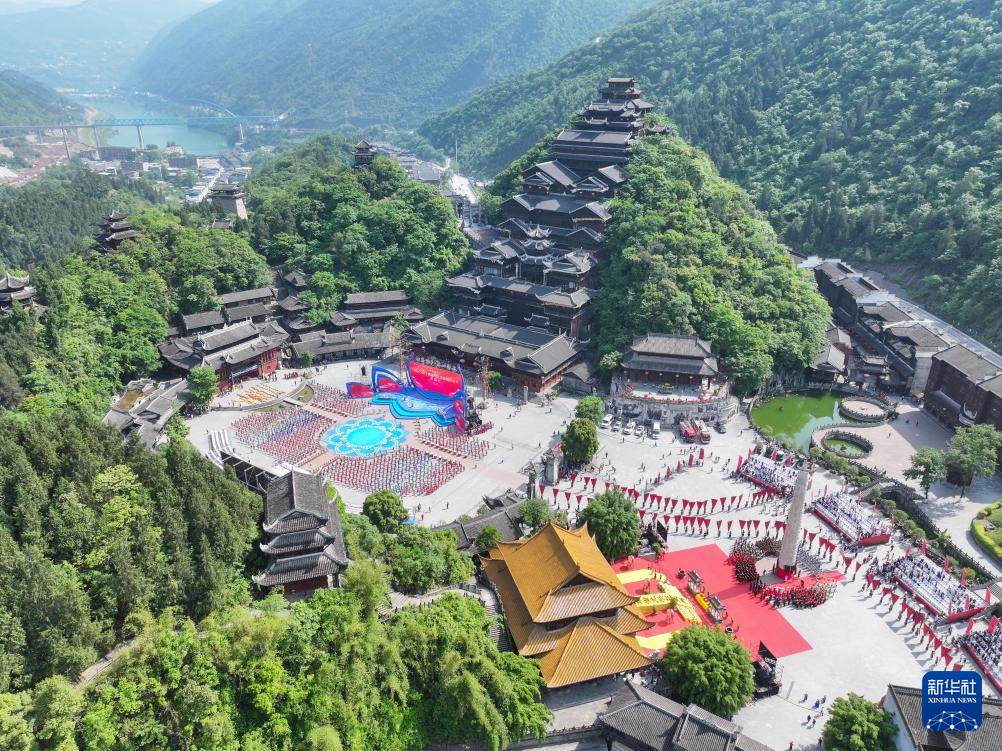 4月28日,苗族同胞在重庆市彭水苗族土家族自治县的蚩尤九黎城庆祝传统节日(无人机照片)。