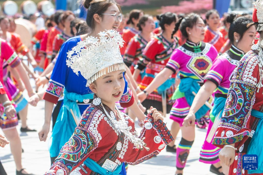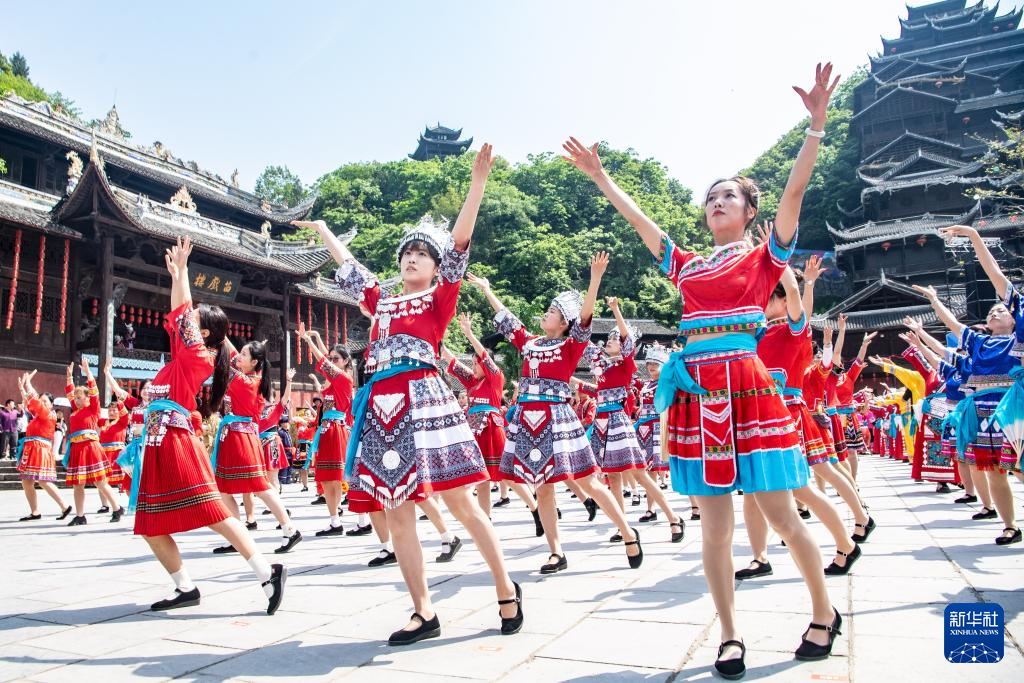 4月28日,苗族同胞在重庆市彭水苗族土家族自治县的蚩尤九黎城庆祝传统节日。