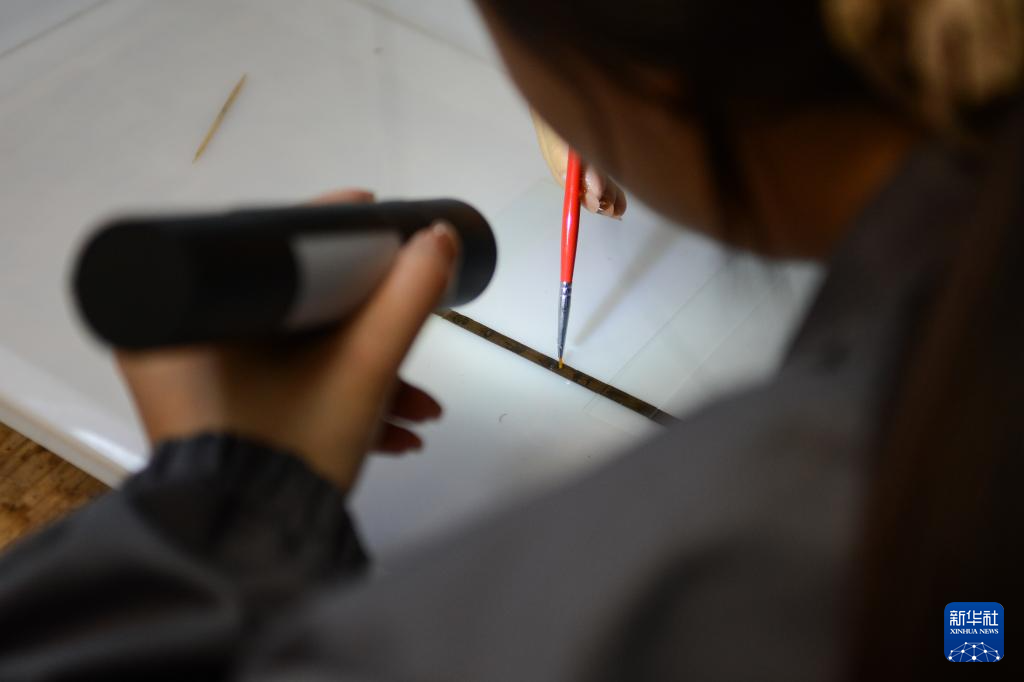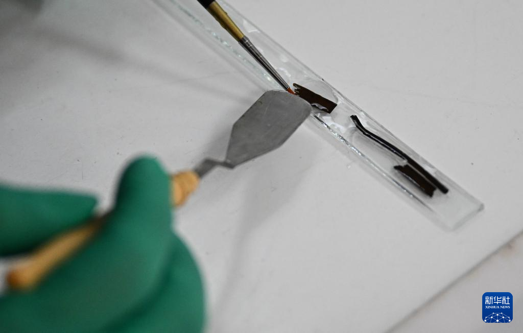 4月24日,荆州文物保护中心简牍工作室工作人员在处理竹简残片。
