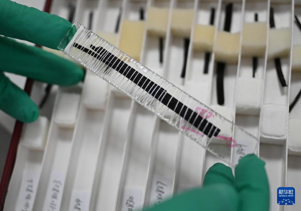 4月24日,主持“饱水简牍墨迹化学显影新技术研发与应用”项目的魏栋副教授(左)与工作人员检查扫描后的竹简文字。