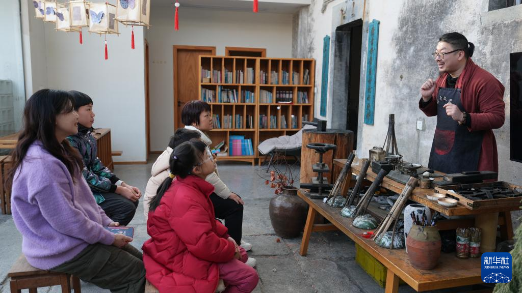安徽黟县宏村镇龙江村,一座明清老宅里,国家级非遗“徽墨制作技艺”的当地代表性传承人申易鑫手握一柄方锤,在一团粘糯滋润的墨坯上反复锤敲,向围坐身旁的亲子家庭演示徽墨制作技艺。案几上,斑驳的制墨工具,诉说着徽墨传承的千年时光。