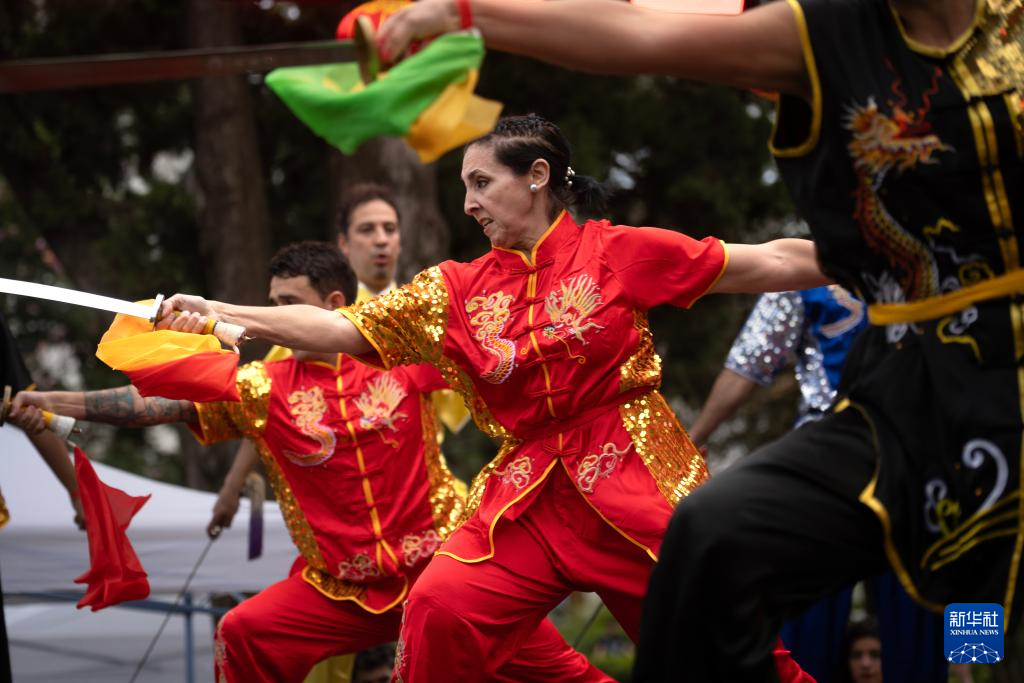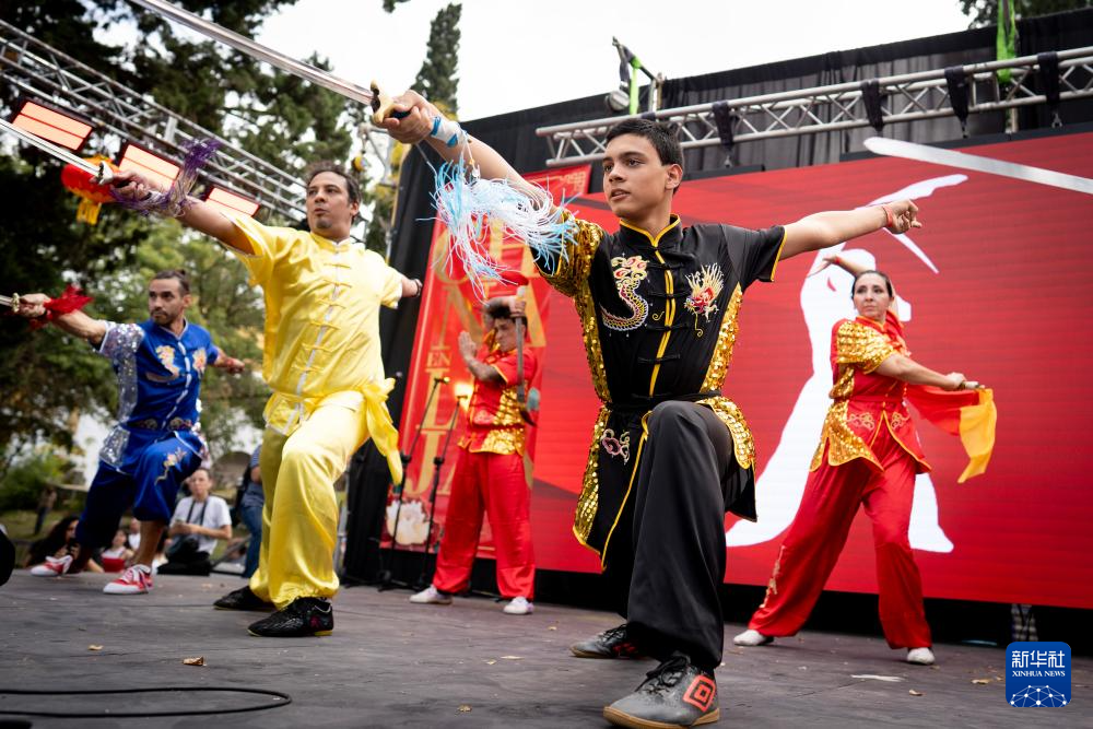 5月4日,人们在阿根廷卢汉举行的“中国在卢汉”文化节上表演舞剑。