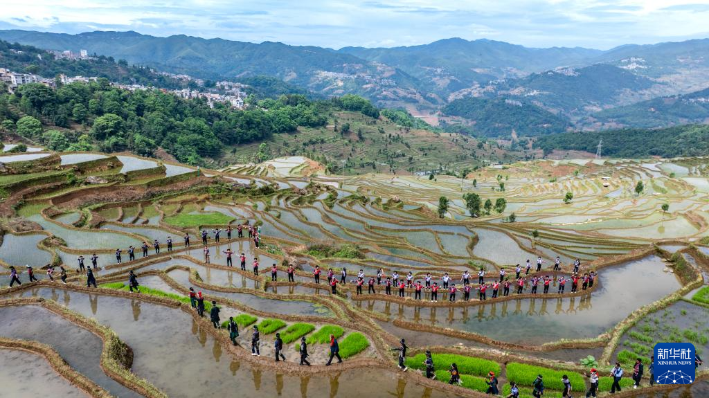 5月2日,在云南省红河县甲寅村“开秧门”仪式上,村民身着民族服饰,沿着田埂踏歌而行(无人机照片)。