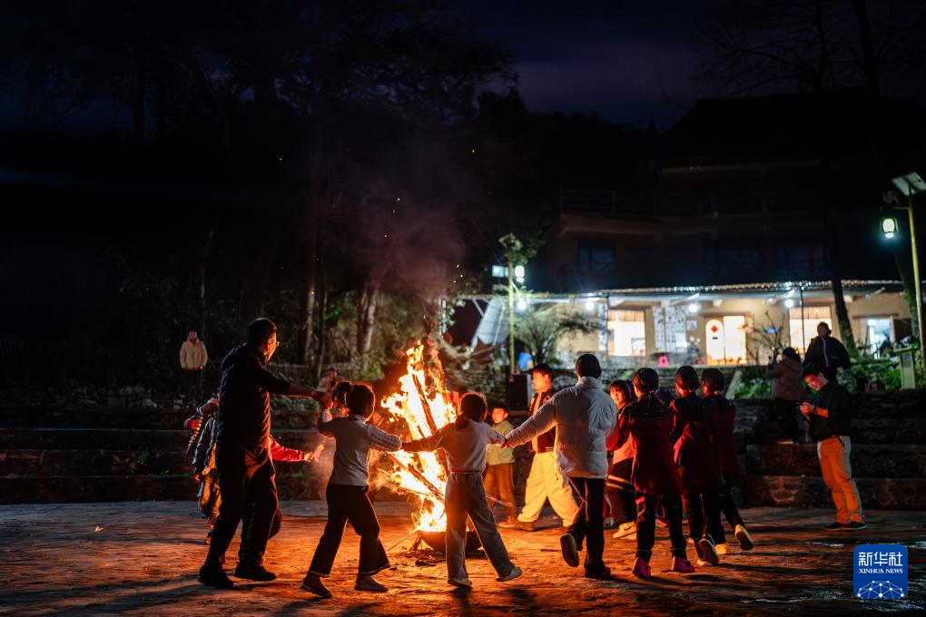 2月26日,在云南省元阳县多依树村,哈尼族群众和游客围着篝火跳乐作舞。