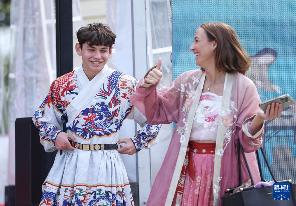 5月11日,在新西兰奥克兰,游客在“茶和天下”·雅集游园活动上体验汉服。