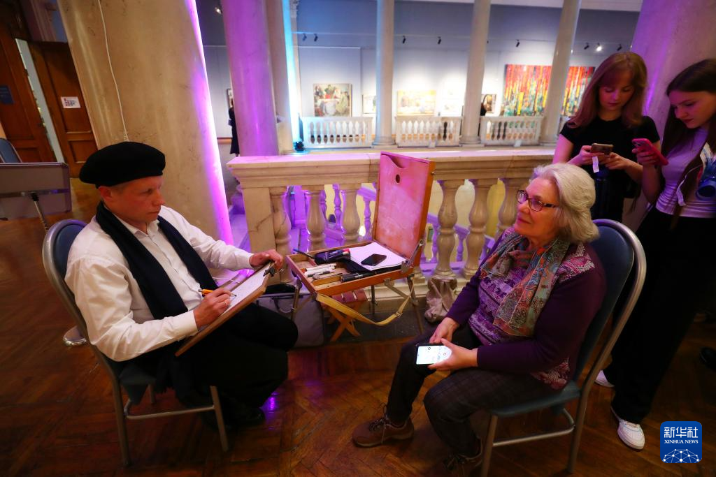 5月17日,参观者在白俄罗斯首都明斯克的白俄罗斯国家美术馆参加漫画素描体验活动。