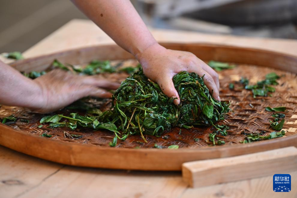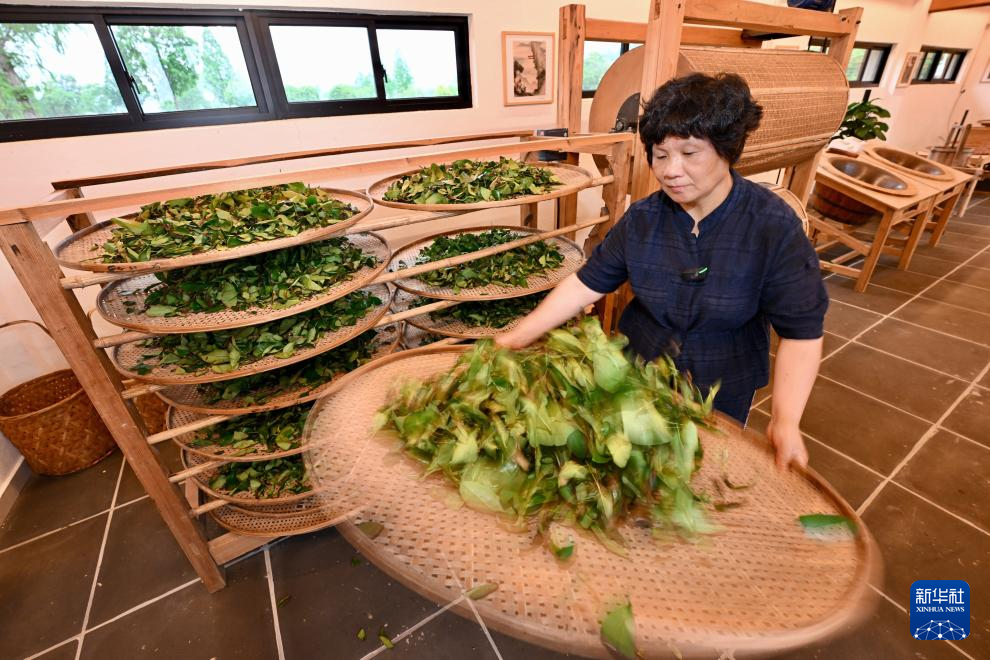 5月7日,国家级非物质文化遗产武夷岩茶(大红袍)制作技艺省级代表性传承人游玉琼展示岩茶摇青工艺。