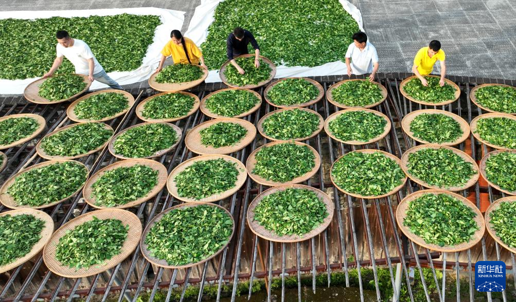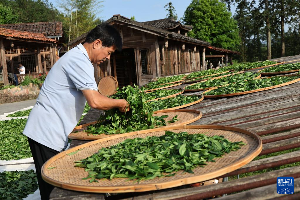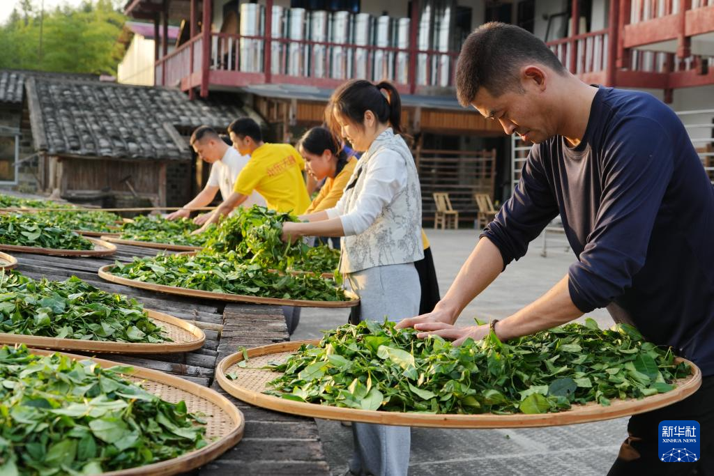 5月3日,武夷山茶农在晾晒青叶,对茶青进行日光萎凋。