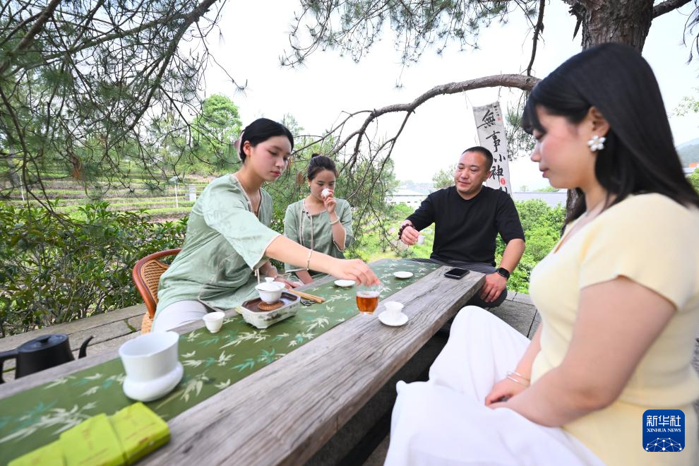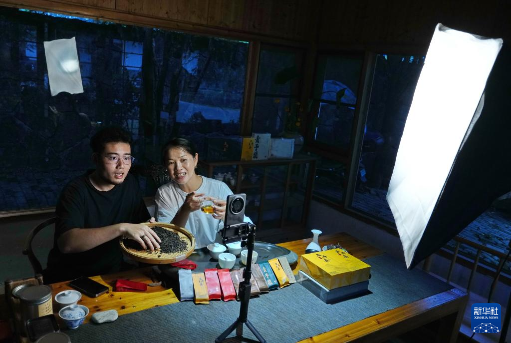 武夷山市星村镇年轻茶农通过网络直播推介自己制作的新茶(2024年7月11日摄)。