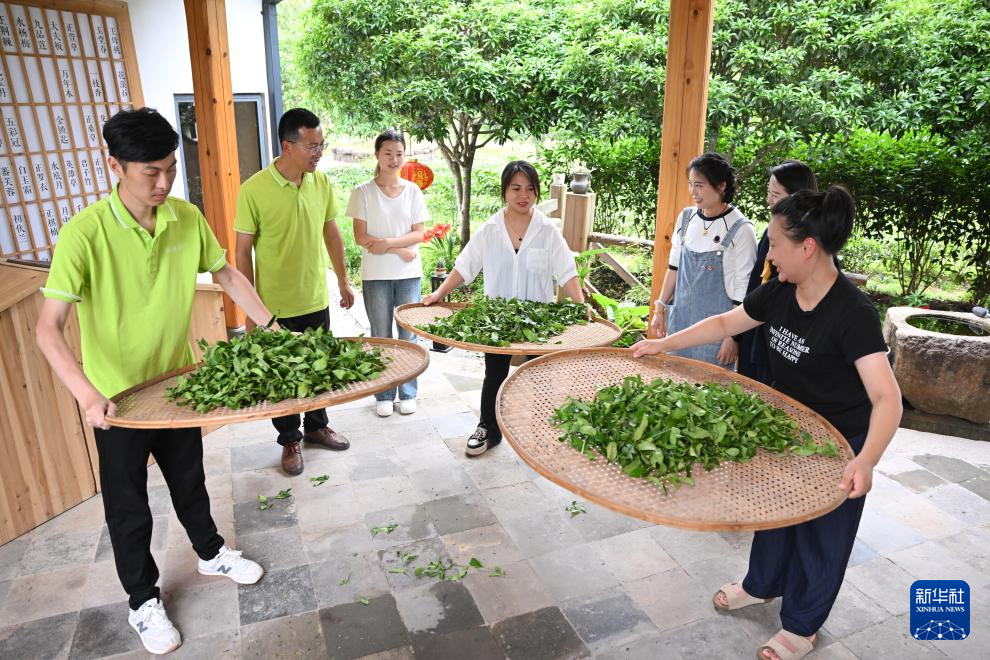 5月2日,国家级非物质文化遗产武夷岩茶(大红袍)制作技艺县(市)级代表性传承人刘峰(右二)带领茶农对茶青进行日光萎凋。