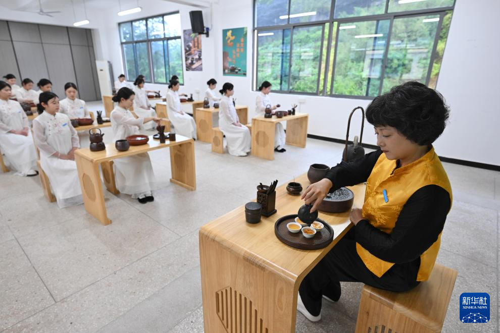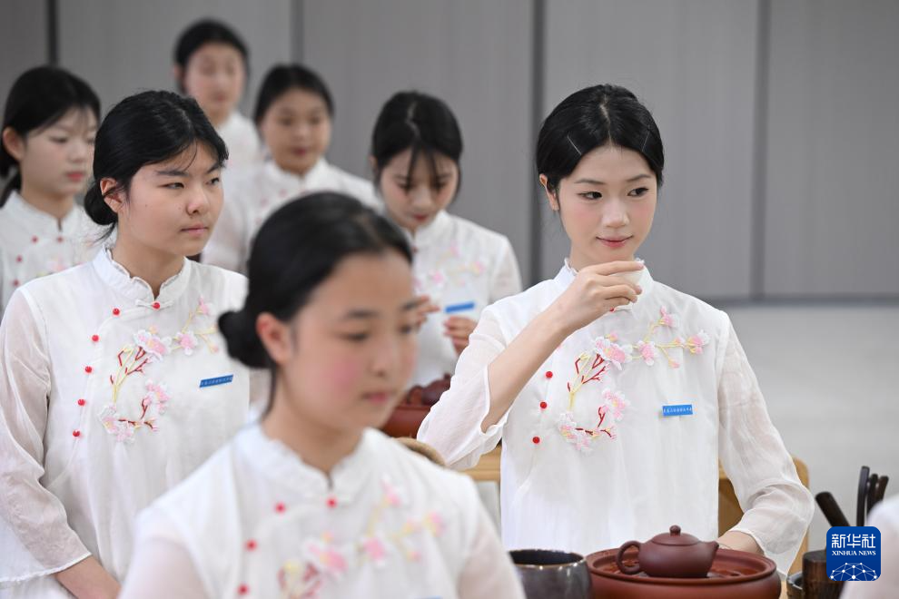 5月8日,武夷山旅游职业中专学校茶艺与茶营销专业的学生在老师的示范下学习茶艺。