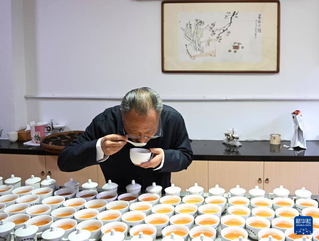 5月9日,福建省武夷山市桐木之星正山小种红茶茶业专业合作社发起人江元勋在审评新制作的茶。